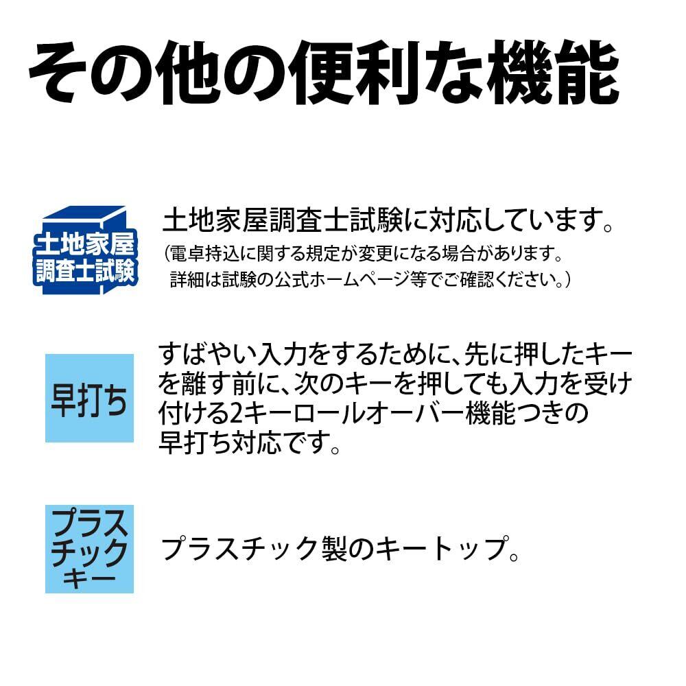 シンプル&コンパクトなデザイン。持ち運び時にキーを保護するスライド式のハードケースつきです。文字天地10mmの大型表示を採用。見やすい3桁位取りつき。カンタンに計算できる便利機能。■統計計算。各種統計量(平均値、標準偏差、母標準偏差など)を求められます。■N進計算。情報処理に役立つ2進・8進・16進の変換や計算ができます。■複素数計算。複素数の加減乗除計算ができます。土地家屋調査士試験に対応。すばやい入力をするために、先に押したキーを離す前に、次のキーを押しても入力を受け付ける2キーロールオーバー機能つきの早打ち対応です。プラスチック製のキートップ。