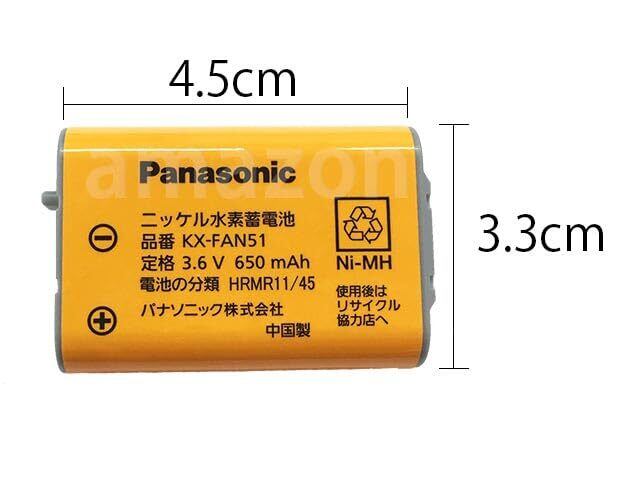 コードレス子機用電池パックは1個入りですが、表と裏の画像を使用しています。 ●メーカー:パナソニック ●型番:KX-FAN51 ●商品名:コードレス子機用電池パック ●コードレス子機用 ●ニッケル水素蓄電池 ●定格:3.6V・650mAh 【対応機種】