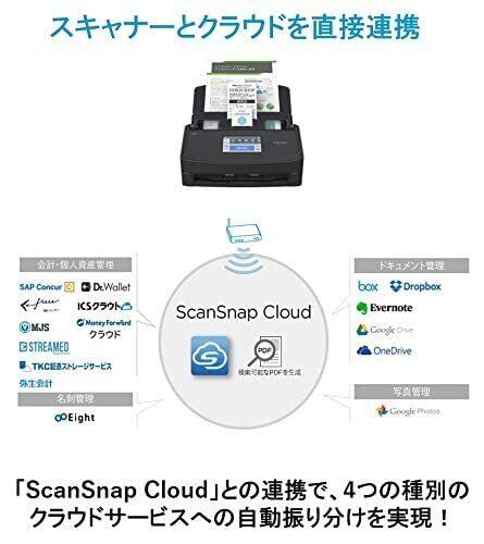クラウド保存もワンタッチ!Wi-Fi(2.4/5GHz帯)対応でスキャナーがPCやスマートデバイスとワイヤレスでつながるだけでなく、インターネットにも直結。文書管理、名刺管理、経費精算や家計簿などの多彩なクラウドサービスへの保存もタッチパネルからワンタッチ。