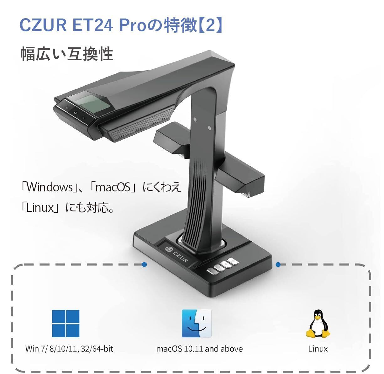 【ETシリーズ最新モデル、ET24 Pro】ETシリーズ最高の2400万画素・320dpiの高画質・高解像度、1.0秒/ページ*1の高速スキャンで、見開きページをあっという間に電子化する裁断不要のブックスキャナー。ブランド最高レベルの補正精度で、見開き時にできる本の歪みもキレイな四角いデータに自動補正します。 対応するOSは「Windows」「macOS*2」にくわえ、ET24 Proでは新たに「Linux」に対応。異なるOSが共存する環境でも専用ソフトを入れておくだけでシームレスに共有可能に。 *1:スキャンボタンを押してから、次にボタンが押せるようになるまでの所要時間(≒取り込み速度)ご利用のパソコンの性能によって、取り込み後のデータ処理に時間がかかることがありますが、そのまま次のスキャンを開始いただけます。 *2:最新「M2」プロセッサを搭載したMacにも対応