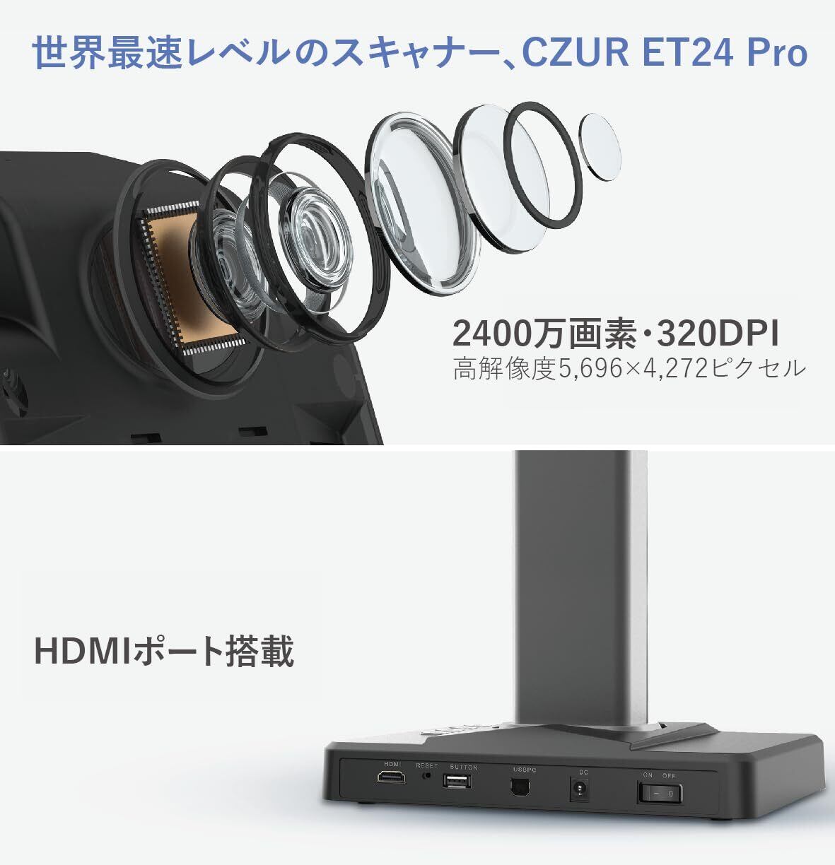 【数量限定】CZUR ET24 Pro ブックスキャナー A3対応 2400万画素 非破壊 高速スキャン 3本レーザー補正搭載 Windows/Mac対応 電子帳簿保存法対応 OCR機能 自動平坦化 歪み補正 HDMI出力 日本国内専用 光学ドライブ不要