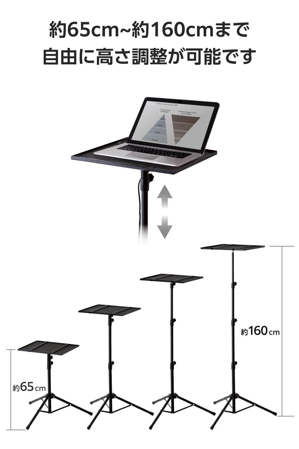 三脚とポールをつなぎ合わせ、650mm~1600mmまで3段階の高さに調節が可能。(地面から天板までの高さ)移動先でのスクリーンとの距離など、さまざまな環境に対応します。