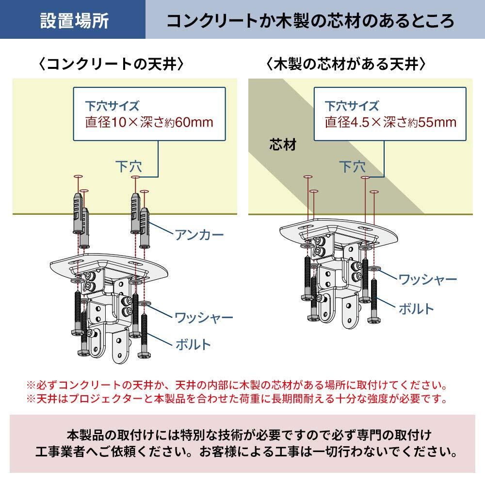 プロジェクターを天井に設置できる汎用性の高いプロジェクター天吊り金具です。上下・左右の角度調節や回転が可能で、映像の高さや傾きを調整できます。
