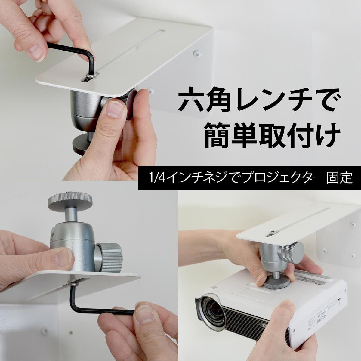 スマートなL型金具を壁に固定すれば、簡単にプロジェクターを吊り下げ可能。プロジェクター背面に三脚用のネジ穴(1/4インチネジ)があれば、簡単に設置できます。(※耐荷重は3kg以下)テープルや三脚を立てる手間とスペースを解消!床や天井への投影もできます。 球状ヘッド利用で自由に傾き360度回転可能なので、プロジェクターはどんな向きにも対応します。【注意】※本製品にはプロジェクターは含まれておりません。 ※ご購入前に本製品を設置する場所の下地をご確認ください。