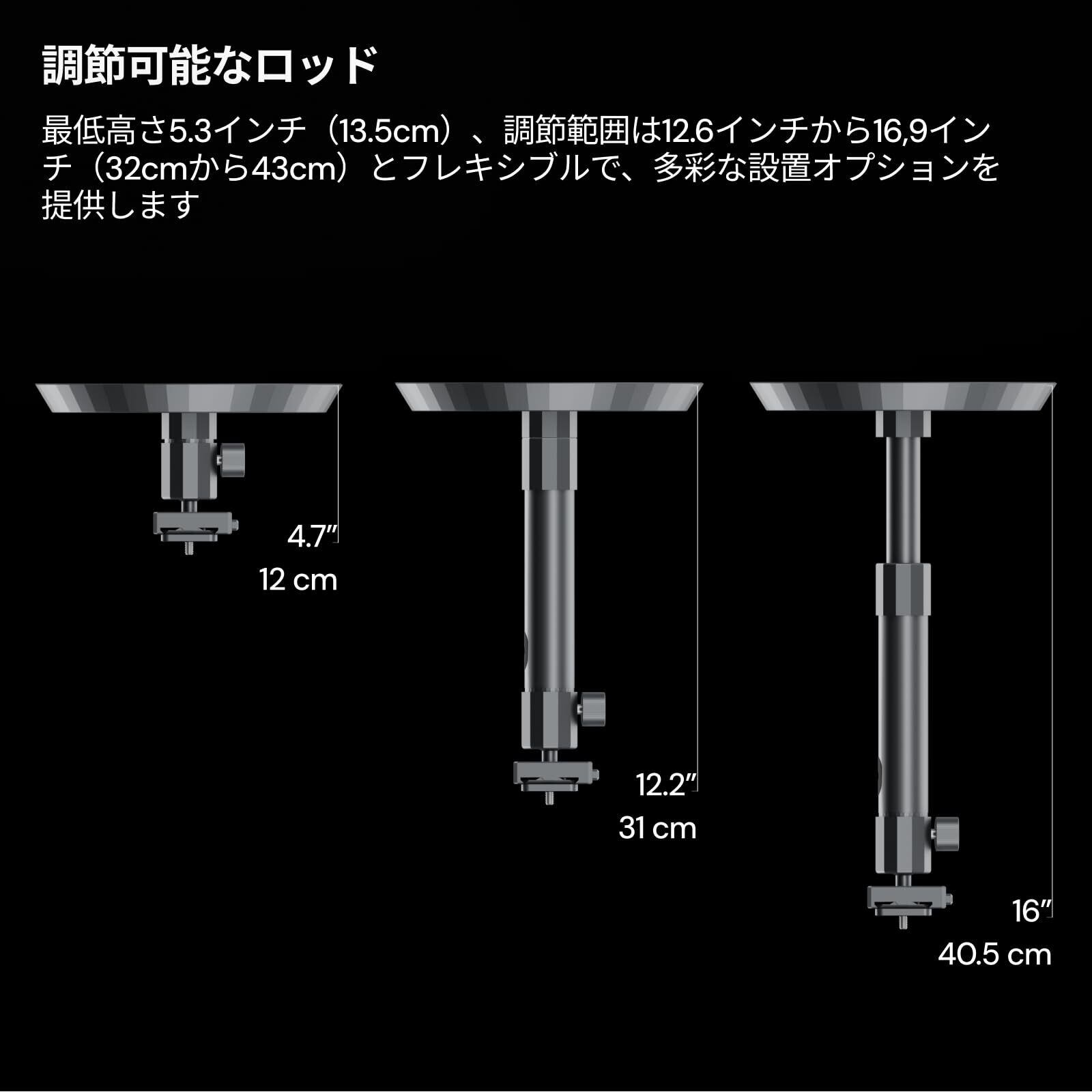 高さ調節可能: 延長ロッドを使用して31cmから40.5cmまで調節可能(延長ロッドなしの高さは12cm)なので、プロジェクターを理想的な視聴高さに配置できます。