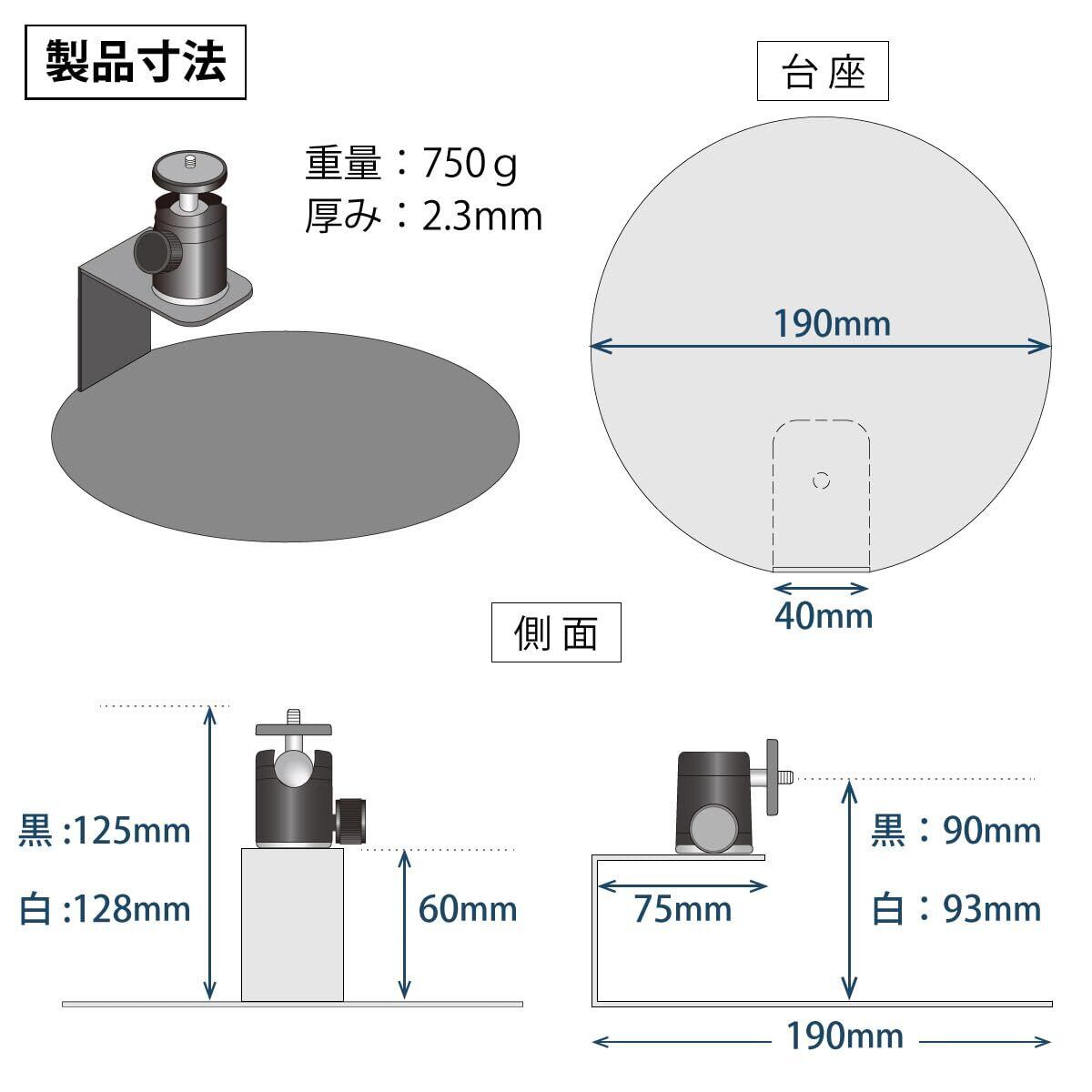 【製品仕様】ボールヘッド部分:上下左右の傾き(最大)±90度、360度回転、国際規格の1/4インチネジ【製品寸法】台座プレート直径:190mm、台座プレート厚み:2.3mm、高さ(最大) 128 mm、重量 750g【内容物】台座プレート、ボールヘッド、六角レンチ、ボールヘッド用ネジ、取扱説明書 【製品保証】1年