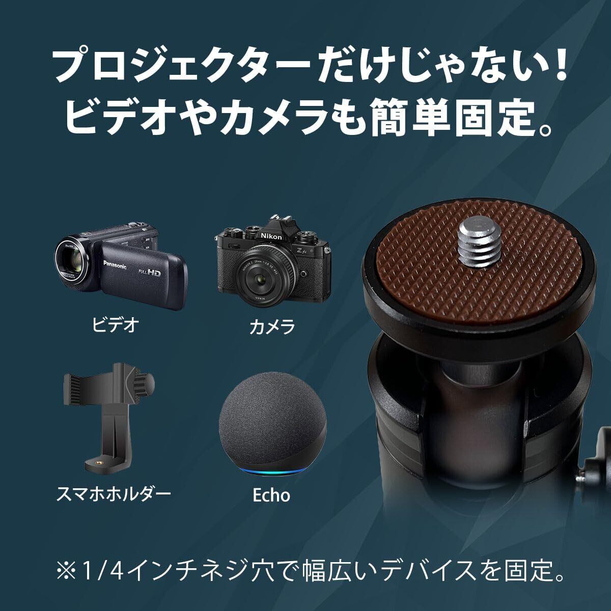【対応プロジェクター】底面に1/4インチネジ穴(三脚用ネジ穴)のある機種・重量3kg以内 ※プロジェクター以外にも1/4インチネジ穴があるカメラ、ビデオ、スピーカー、見守りカメラ、スマホホルダーも取り付け可能です。