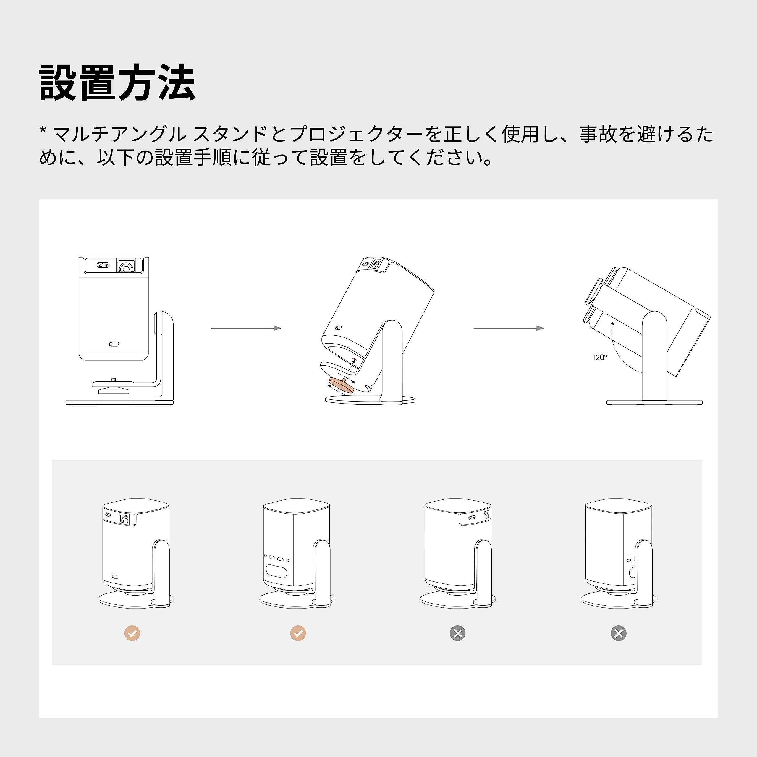 【パッケージ内容】マルチアング スタンド x 1台、製品取扱説明書 x 1部。 マルチアングル スタンドとプロジェクターを正しく使用し、事故を避けるために、設置手順に従って設置をしてください。 製品の損傷や故障を避けるため、マルチアングル スタンドを120°以上動かしたり、調整したりしないでください。