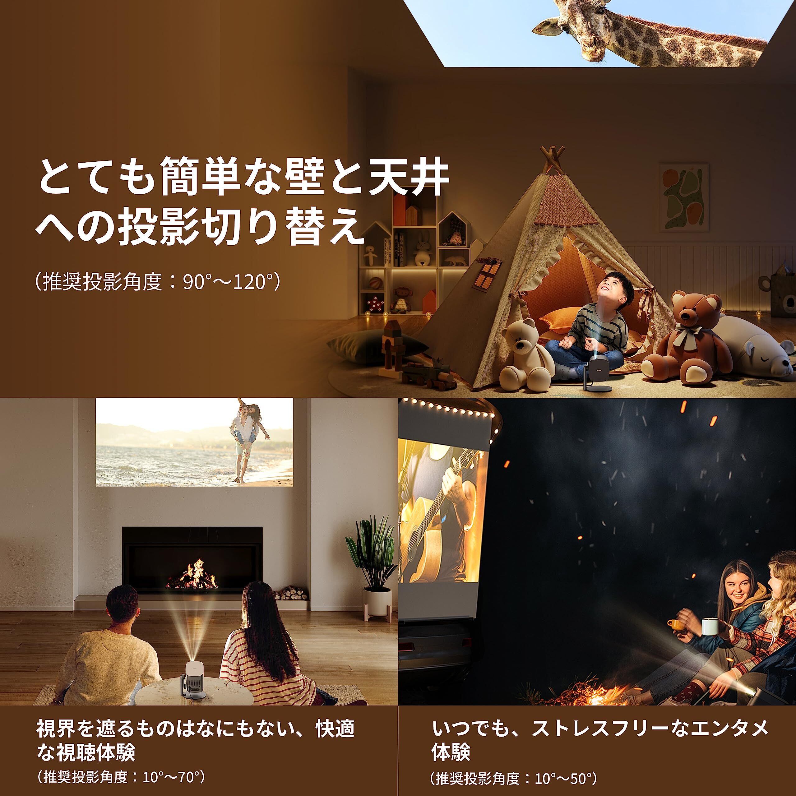 【120°の楽しみ 天井に広がる映画の世界】最大120°まで調整可能な投影角度。適切な視野角に設定しましょう。壁から天井へのスクリーンの切り 替えもとてもスムーズです。どんな場所にもスクリーンを登場させる準備は、これで完了です。