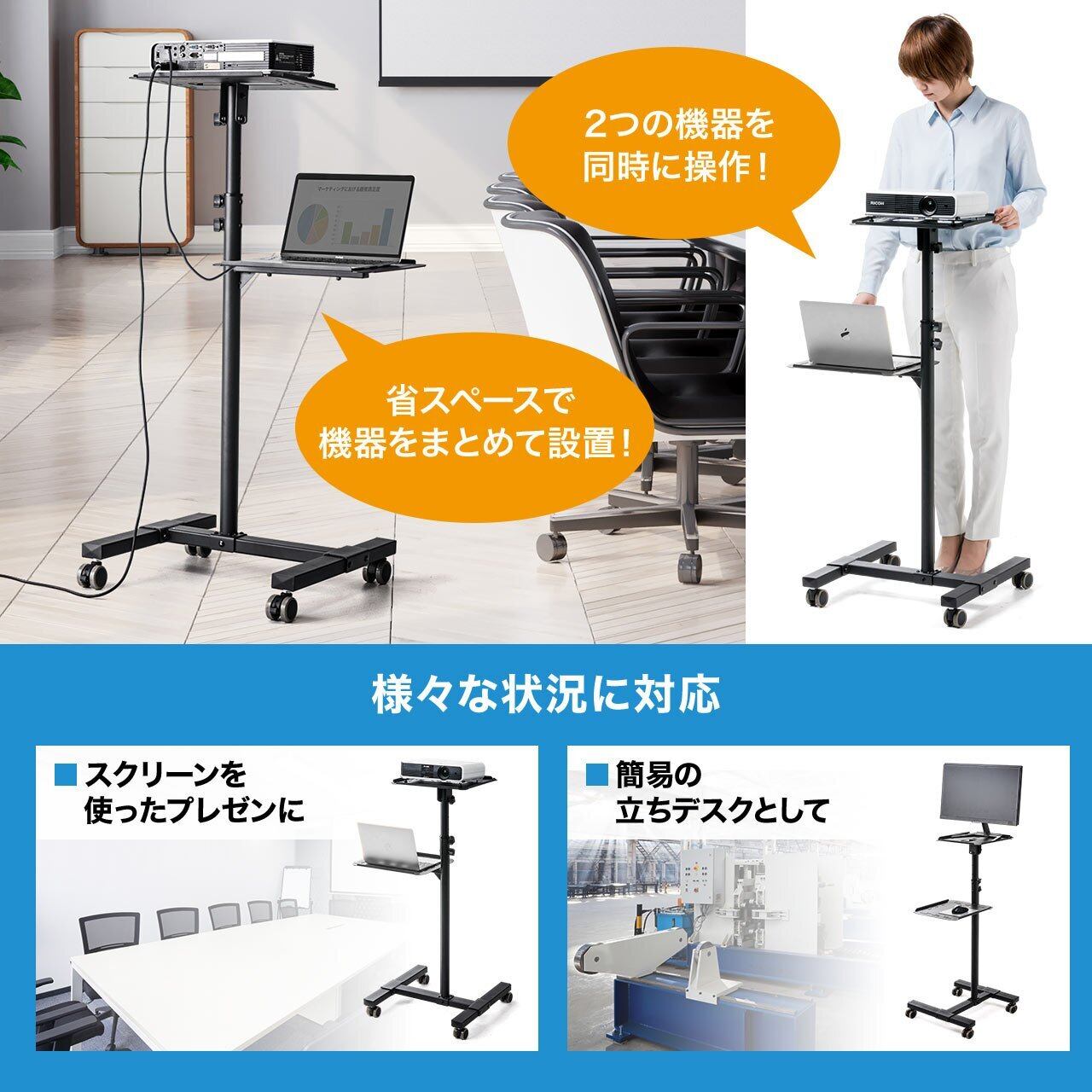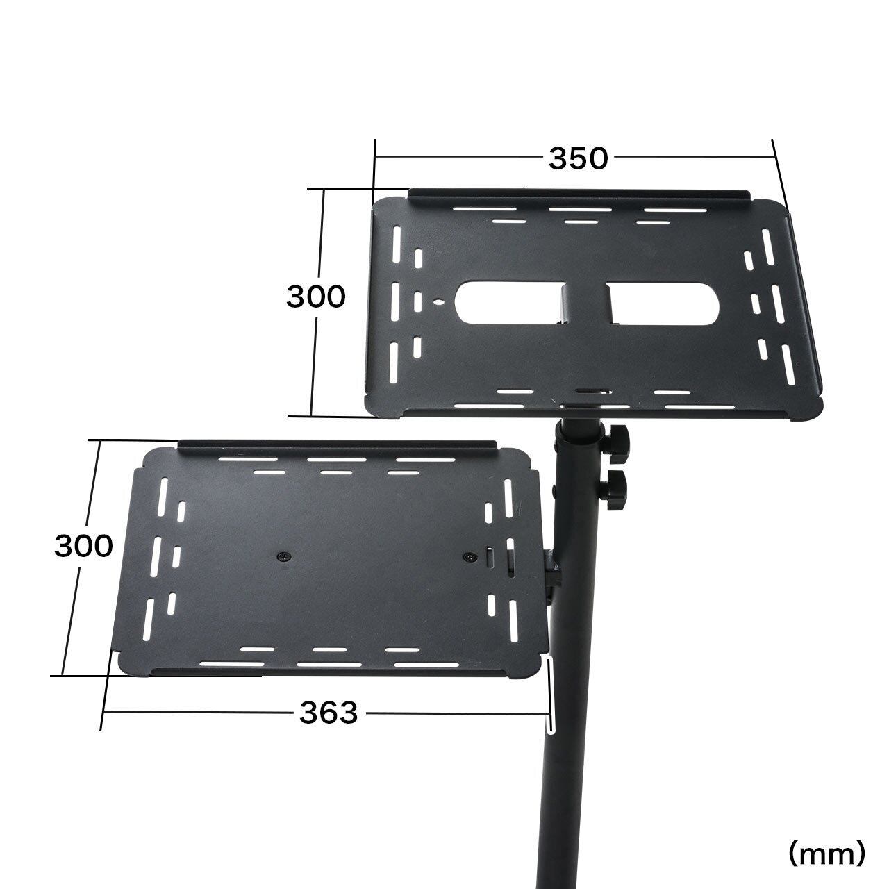 天板と中棚にはプロジェクターやノートPCなどの2台の機器を設置することができるスタンドです。
