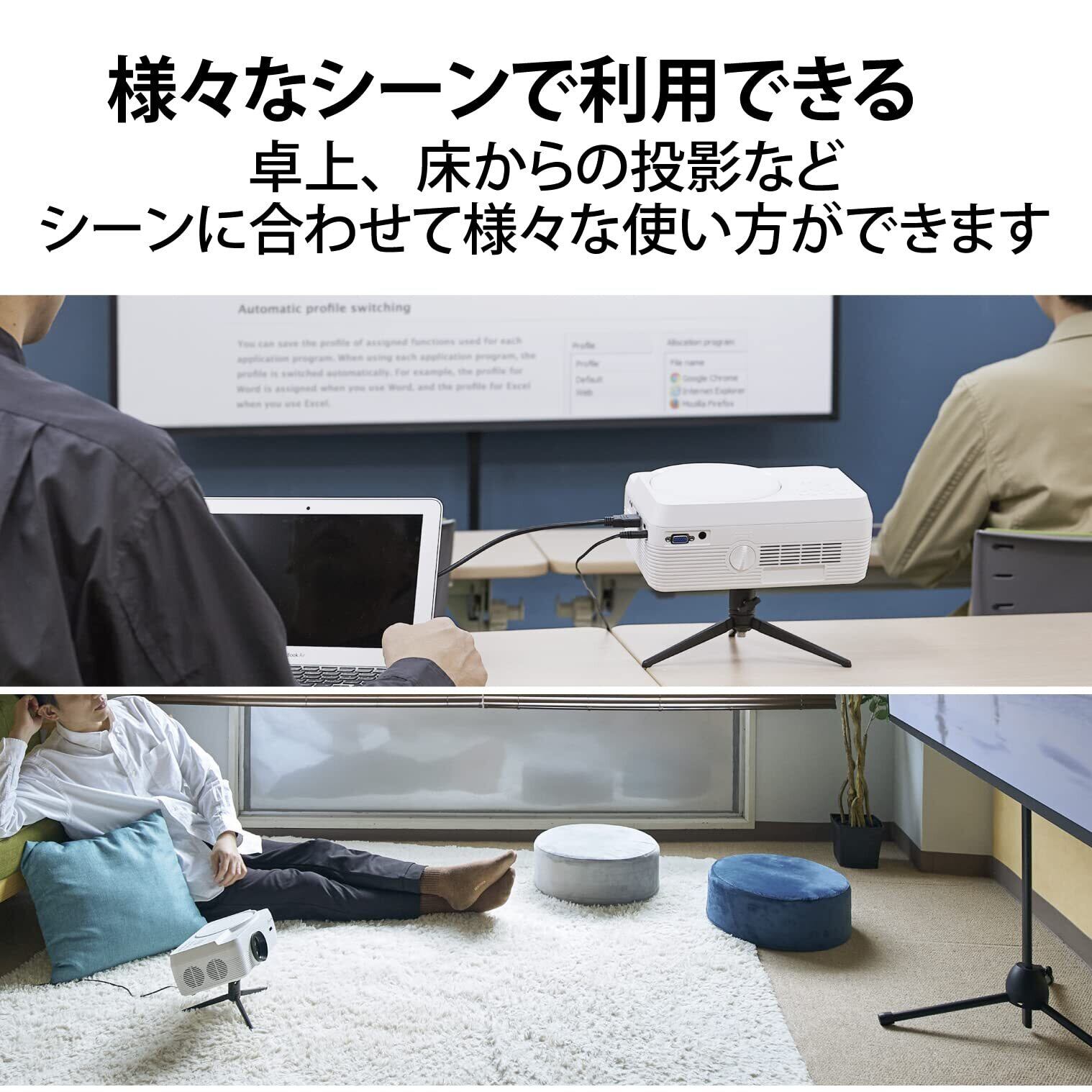 卓上からの投影、床からの投影などシーンに合わせて様々な使い方ができます。