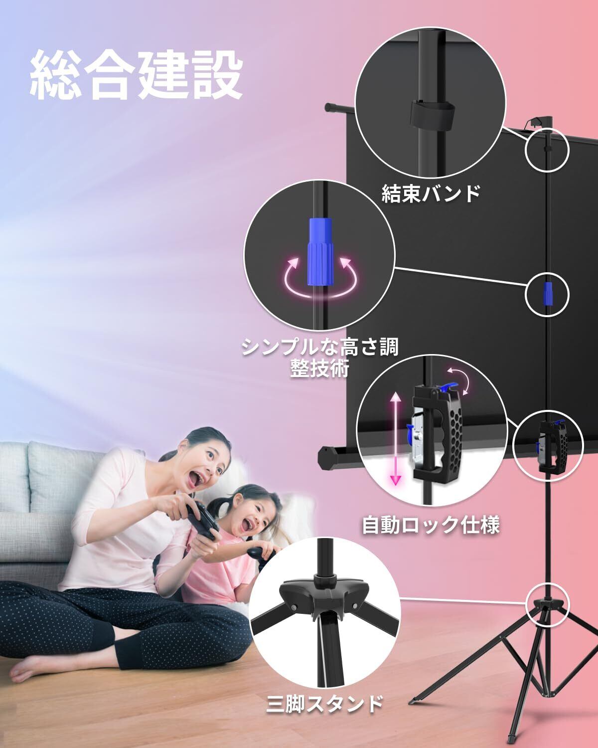 しわができにくい最高級のマットVCを使用した、三脚スタンド付きのプロジェクタースクリーンです。映画を見たり、ゲームをプレイしたり、PowerPointのプレゼンテーションを表示したりする際に、かつてないほど最高品質の画像を映し出します。