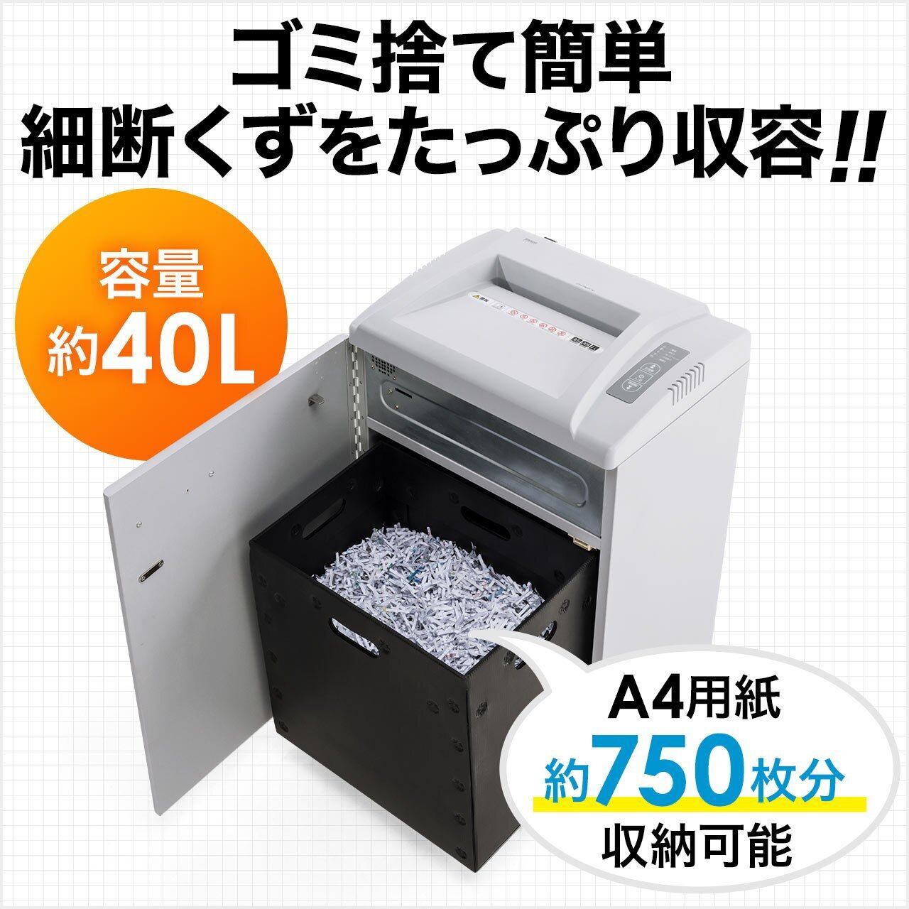 30分間の連続使用が可能で、他の人が使い終わった直後でもしっかり細断できます。約40リットルのダストボックス搭載で、細断くずをたっぷり収容。