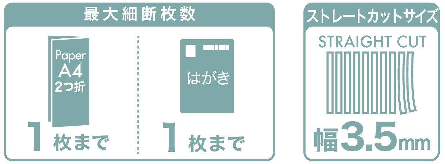 ●細断枚数:紙/1枚(A4コピー用紙64g㎡/縦二つ折り)、郵便はがき/1枚(厚み0.2mmまで)