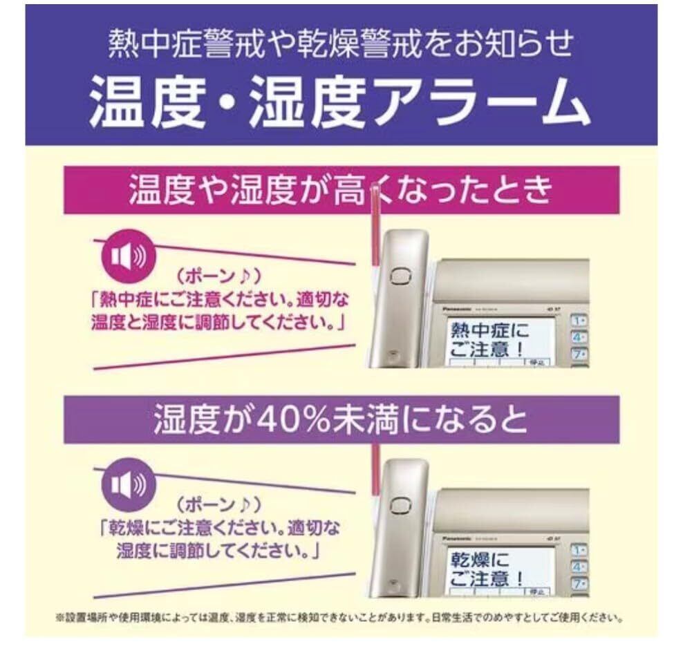 ※1お買い上げ時は温度・湿度アラームの機能は働きません。使い方に合わせて設定してください。 本機の温度・湿度表示と温度・湿度アラームの機能は、医療用、介護用、育児用、業務用などを目的としたものではありません。また、本機は熱中症発症、乾燥を防止できる製品ではありません。本機能を使用することによる損害の発生などについて、当社の故意、過失により生じた場合を除き、当社は責任を負いかねますので、あらかじめご了承ください。
